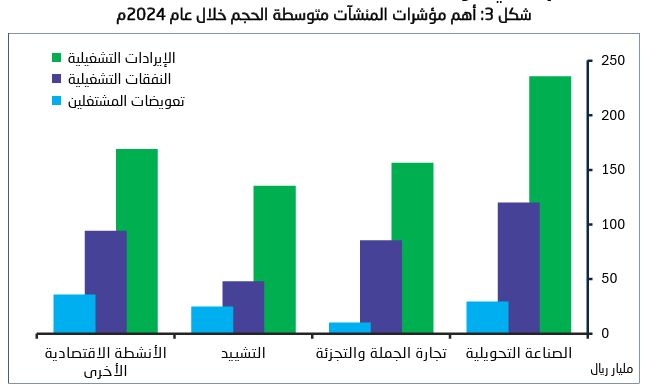 وبلغت قيمة النفقات التشغيلية 347.4 مليار ريال، إذ شكلت منها أنشطة الصناعة التحويلية مانسبته 34.6% وأنشطة تجارة الجملة والتجزئة مانسبته 24.6%، وأنشطة التشييد مانسبته 13.7%، أما بقية الأنشطة الاقتصادية الأخرى فقد شكلت مجتمعة 27.1%، من إجمالي النفقات التشغيلية في المنشأت متوسطة الحجم.
