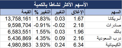 وعلى صعيد الأسهم النشطة من حيث الكمية، جاء سهم "أمريكانا" في الصدارة بكمية تداول بلغت 13.76 مليون سهم، وحل سهم "صادرات" ثانياً بـ 9.6 مليون سهم.