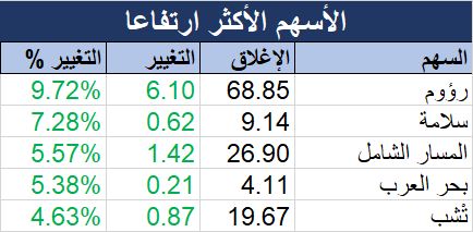 وعلى صعيد أداء الأسهم، شملت المكاسب 202 سهم تصدرها سهم "رؤوم"، بعد صعوده 9.72%، تلاه سهم "سلامة" بارتفاع نسبته 7.28%.