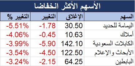 وجاء إغلاق 59 سهماً باللون الأحمر، بصدارة سهم "اليمامة للحديد" الذي أغلق متراجعا 5.51%، وكان المركز الثاني لسهم "أملاك" بنسبة تراجع بلغت 4.06%.