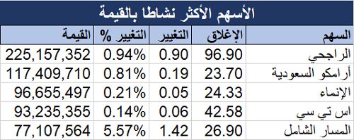 وتصدر سهم "الراجحي" نشاط الأسهم من حيث القيمة، بـ 225.16 مليون ريال، وأغلق مرتفعاً 0.94%، وجاء سهم "أرامكو السعودية" في المركز الثاني بقيمة تداول بلغت 117.41 مليون ريال وارتفع السهم 0.81%.