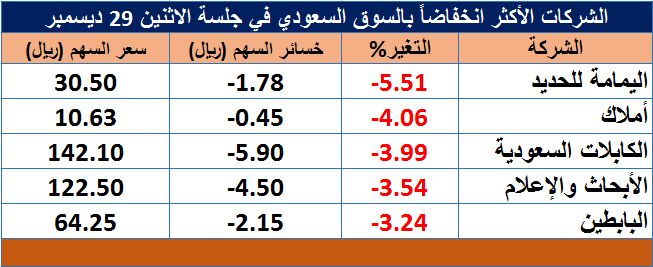 وفي المقابل، تصدر سهم "اليمامة للحديد" الأسهم المتراجعة بنسبة 5.51%، لينهي الجلسة عند مستوى 30.50 ريال.