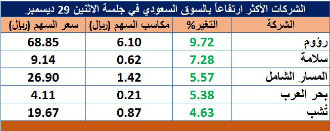 ارتفاع أسهم 202 شركة في "تاسي" بتعاملات الاثنين.. "رؤوم" يتصدر بنسبة 9.7%, اليوم الاثنين 29 ديسمبر 2025 04:09 مساءً