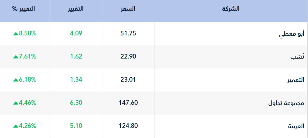 وارتفع خلال تلك اللحظة 168 سهماً، تصدرها أبومعطي بنسبة 8.58%، وتلاه سهم "تشب" بنسبة 7.61%.