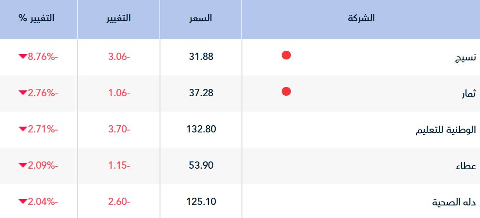 وفي المقابل تراجع أداء 80 سهما فقط تصدرهم "نسيج" بنسبة 8.76%، تلاه سهم "ثمار" بنسبة 2.76%.