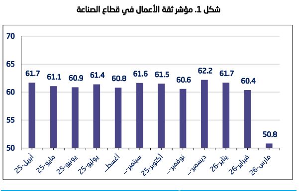 وسجل مؤشر ثقة الأعمال في قطاع الصناعة 50.8 نقطة خلال شهر مارس/ آذار 2026م، محافظا على مستواه المتفائل رغم تراجعه بنسبة 15.8% مقارنة بالشهر السابق، حيث سجل خلاله 60.4 نقطة؛ ويعزى هذا الانخفاض إلى تراجع في مستويات الثقة المرتبطة بالمبيعات للشهر الحالي وتكاليف المدخلات المتوقعة للشهر القادم.