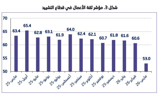 وسجل قطاع التشييد خلال شهر مارس/ آذار 2026م مستوى متفائلا في مؤشر ثقة الأعمال بلغ 53.0 نقطة، ليؤكد استمرار الثقة الإيجابية لدى منشآت القطاع، رغم التراجع بنسبة 12.6% مقارنة بشهر فبراير/ شباط، حيث سجل خلاله 60.6 نقطة، ويعود هذا الانخفاض إلى تراجع في مستويات الثقة لدى منشآت قطاع التشييد، ولا سيما فيما يتعلق بأوامر الشراء للشهر الحالي وتكاليف المدخلات المتوقعة للشهر القادم.