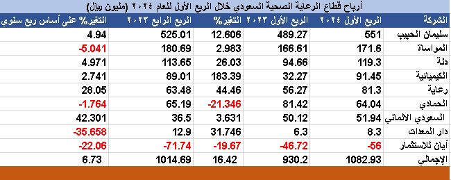 وتصدرت شركة "سليمان الحبيب"، التي اقتنصت نحو 50.88% من صافي أرباح القطاع خلال الربع الأول للعام 2024، شركات قطاع الرعاية الصحية على مستوى الأرباح؛ بواقع 551 مليون ريال، مسجلة زيادة بالربع الأول بنحو 12.61% مقارنة مع أرباحها في الربع نفسه من عام 2023، البالغة 525 مليون ريال.