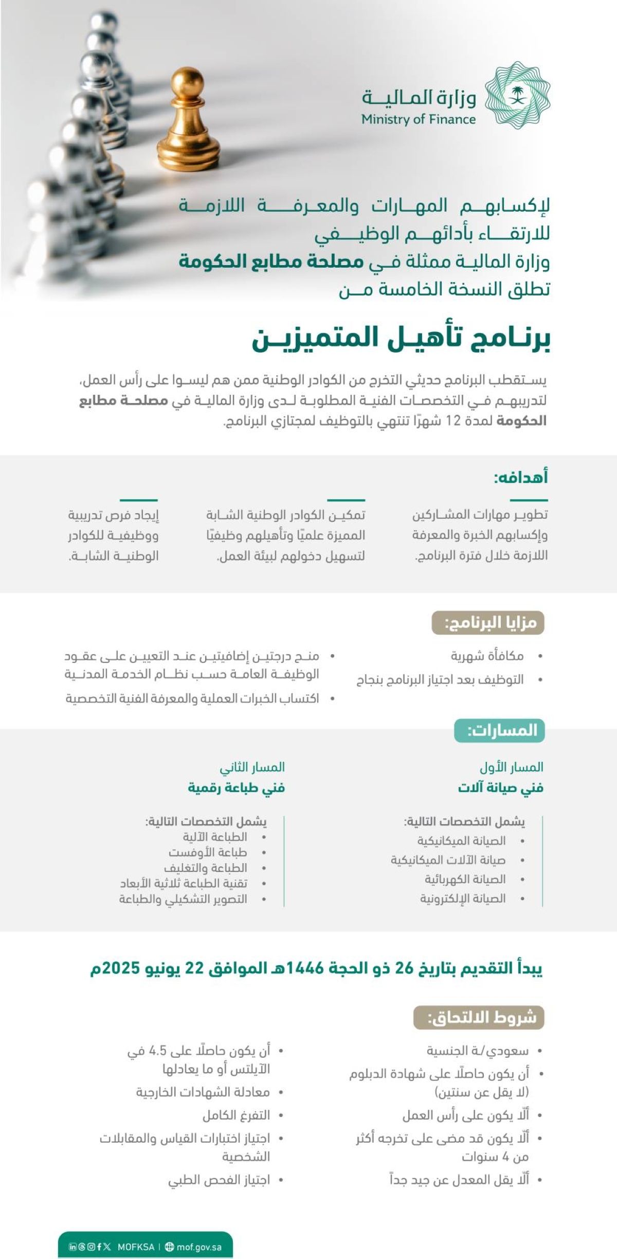 وزارة المالية ممثلة في مصلحة مطابع الحكومة تطلق النسخة الخامسة من برنامج تأهيل المتميزين, اليوم الخميس 29 مايو 2025 09:43 مساءً