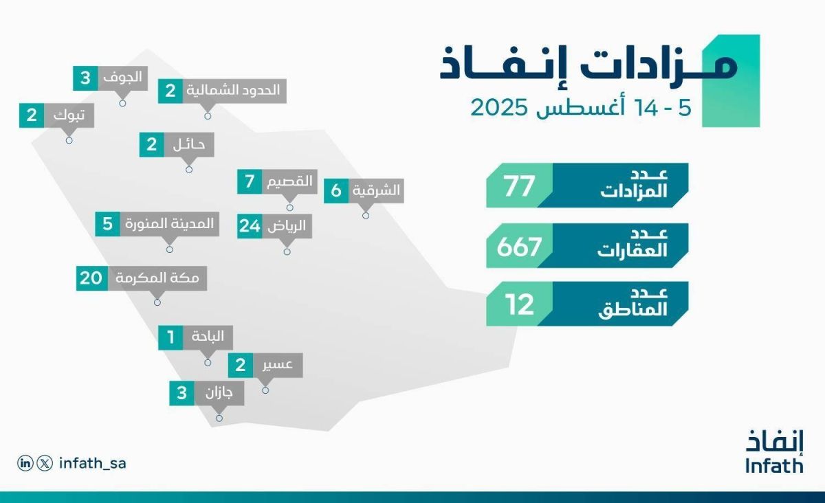 «إنفاذ» يشرف على 77 مزادا لبيع 667 أصلا, اليوم الأربعاء 6 أغسطس 2025 01:00 صباحاً