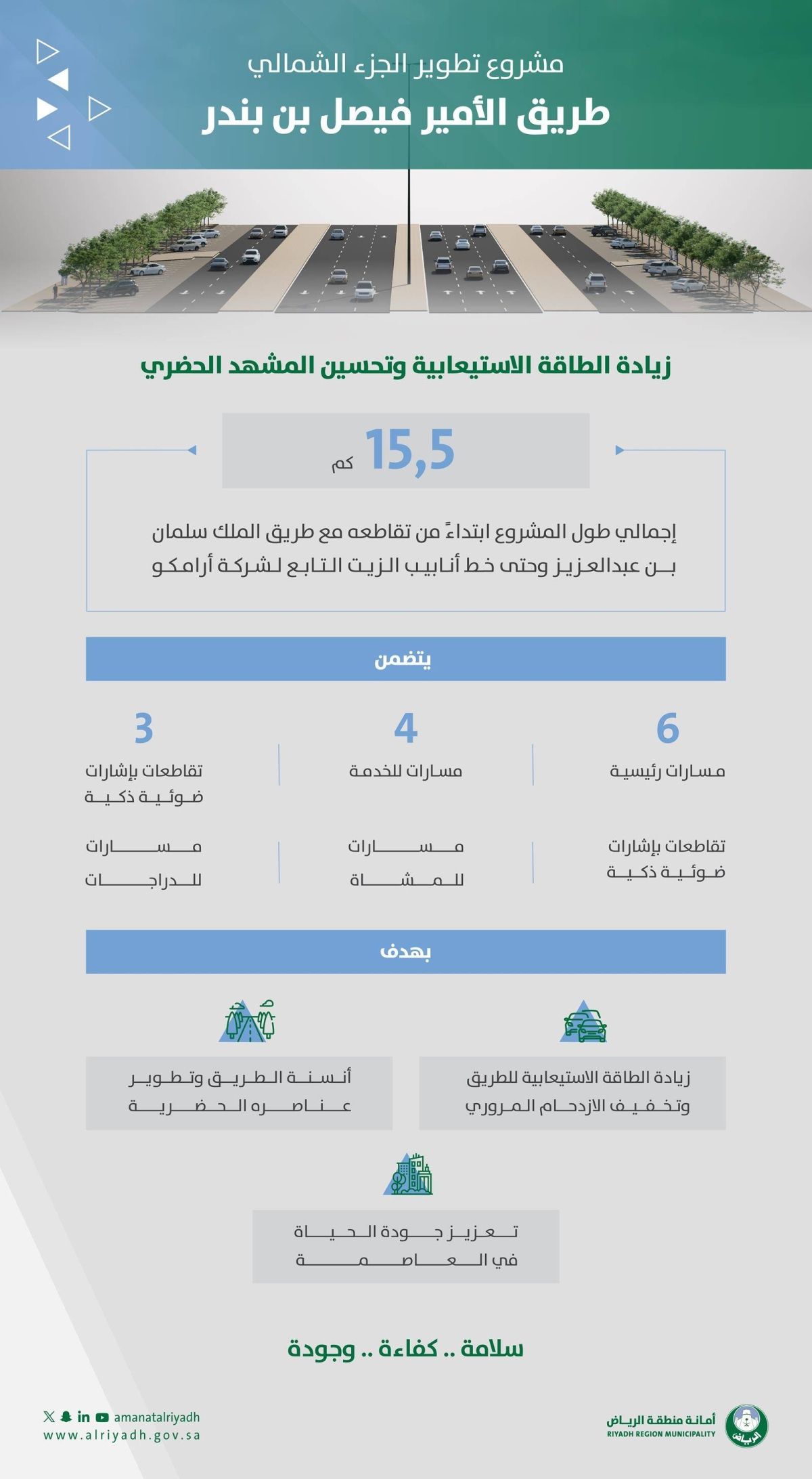 ويمثل مشروع طريق الأمير فيصل بن بندر أحد النماذج التنموية التي تعكس التزام أمانة منطقة الرياض بتحقيق مستهدفات رؤية المملكة 2030، من خلال مشاريع عمرانية مستدامة، وبنية تحتية ذكية، وتحسين متكامل لجودة الحياة في مدينة مزدهرة ومستدامة ترتقي بجودة الحياة.