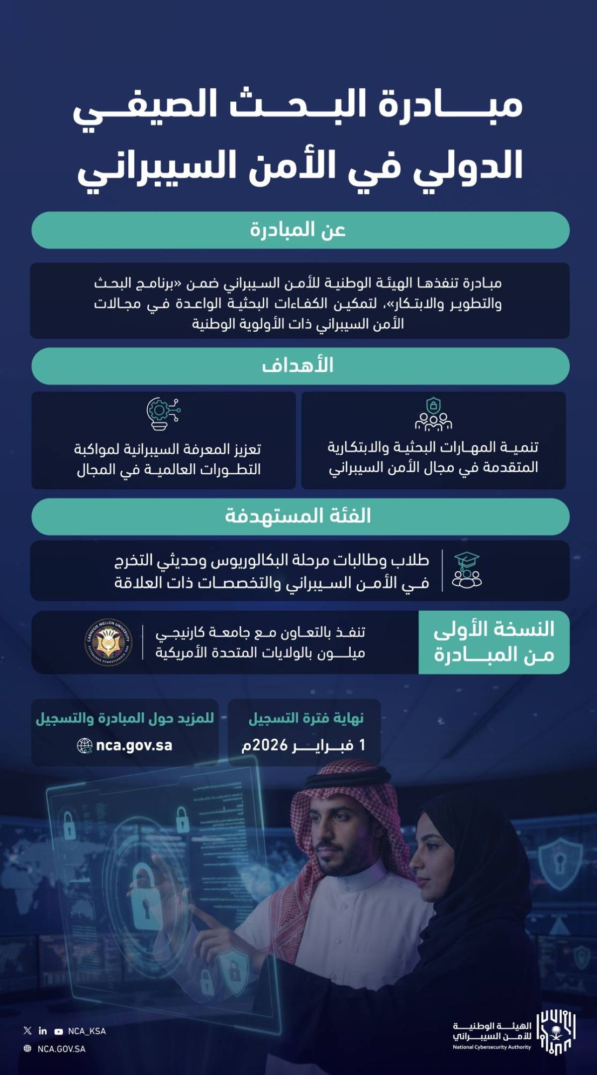 وتتيح مبادرة «البحث الصيفي الدولي في الأمن السيبراني»، فرص الالتحاق في برامج البحث الصيفي لدى أبرز الجامعات العالمية الرائدة في مجالات الأمن السيبراني، والمشاركة في تطوير المشاريع البحثية والاطلاع على أحدث الابتكارات والمقترحات البحثية في المجال، ودعت الهيئة الطلاب والطالبات المستهدفين إلى التسجيل بالمبادرة قبل نهاية يوم الأحد 13 شعبان 1447هـ الموافق 1فبراير 2026م، عبر موقعها الإلكتروني www.nca.gov.sa.