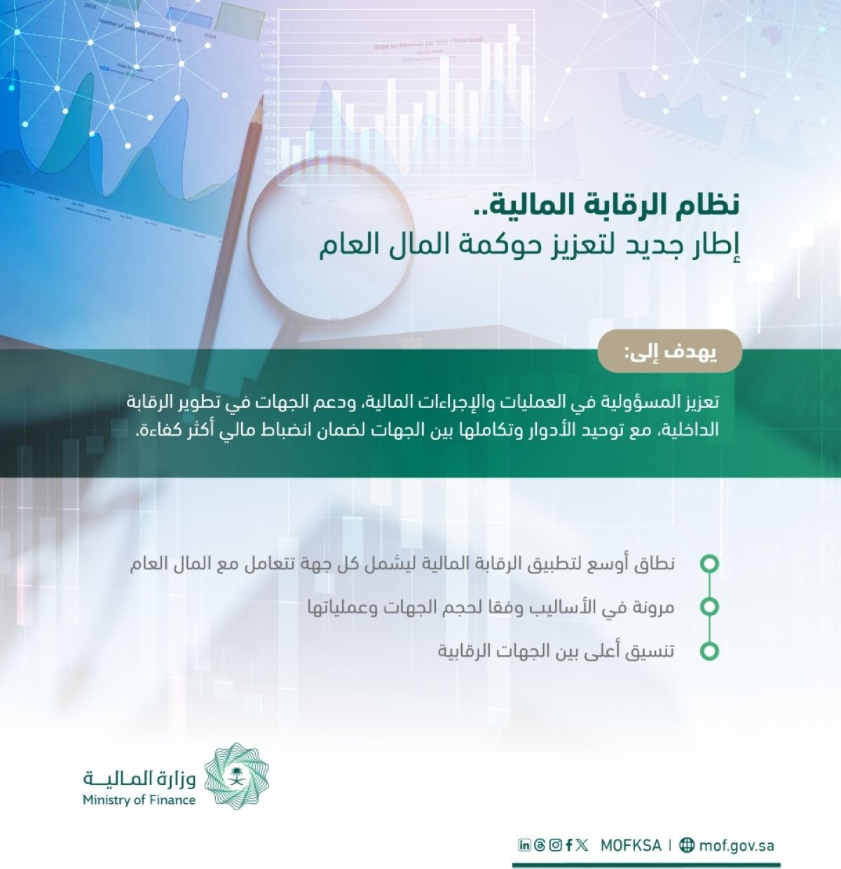 أعلنت وزارة المالية بدء العمل بنظام الرقابة المالية، الصادر من مجلس الوزراء برقم (م/122) وتاريخ 10/06/1447هـ الموافق 1 ديسمبر 2025م، وذلك في إطار تطوير منظومة الرقابة على المال العام وتعزيز كفاءتها، وبما يتماشى مع مستهدفات رؤية السعودية 2030، إذ يحل النظام محل نظام الممثلين الماليين.