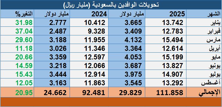 مباشر - السيد جمال: ارتفعت تحويلات الوافدين بالمملكة العربية السعودية خلال الثمانية أشهر الأولى من عام 2025م بنسبة 20.95% على أساس سنوي، وبزيادة تقدر بـ 19.38 مليار ريال (5.17 مليار دولار) مقارنة بــالفترة المماثلة من العام الماضي.