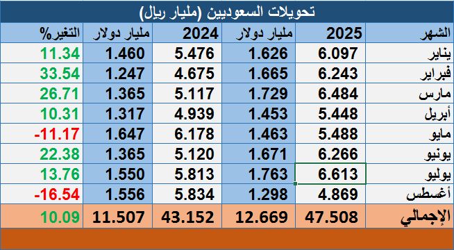 وارتفعت تحويلات السعوديين في الأشهر الثمانية الأولى من عام 2025 بنسبة 10.1% على أساس سنوي؛ لتبلغ 47.51 مليار ريال (12.67 مليار دولار)، مقابل 43.15 مليار ريال (11.51 مليار دولار) في الفترة ذاتها من العام الماضي.