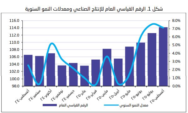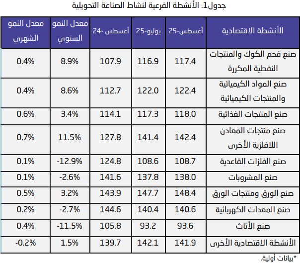 وعلى أساس شهري، ارتفع مؤشر الرقم القياسي لكميات الإنتاج الصناعي بالمملكة خلال أغسطس/ آب الماضي بنسبة 1.4% مقارنة مع شهر يوليو/ تموز.