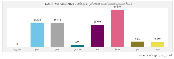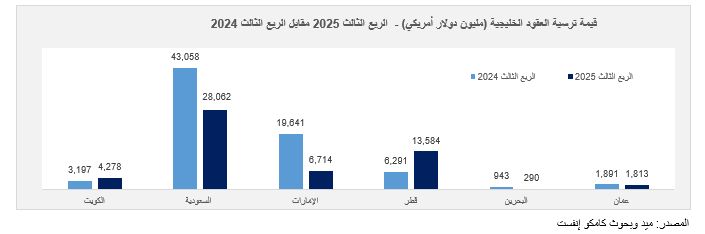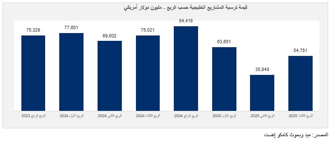 ووفق تقرير وحدة البحوث الاستراتيجيات الاستثمارية بشركة كامكو إنفست، فقد سجلت جميع الأسواق، باستثناء قطر والكويت، انخفاضاً في قيمة المشاريع المسندة على أساس سنوي خلال الربع الثالث من العام 2025.