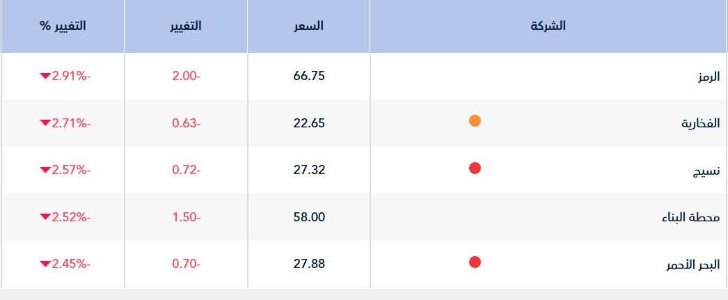 وهيمن التراجع على أداء224 سهما، تصدرها سهم "الزمر" بتراجع نسبته 2.91 %، تلاه سهم "الفخارية" بنسبة تراجع بلغت 2.71%.