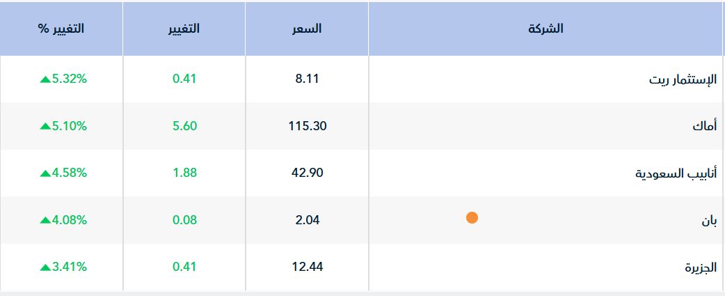 وفي المقابل، جاء 36 سهماً باللون الأخضر بصدارة سهم "الاستثمار ريت" الذي صعد 5.32%، تلاه سهم "أماك" بارتفاع نسبته 5.10%
