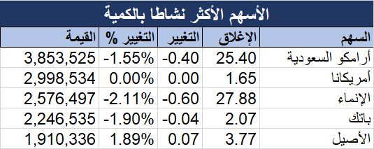 وكانت صدارة أعلى الكميات لسهم "أرامكو السعودية" كذلك، بكمية تداول بلغت 3.85 مليون سهم، تلاه سهم "أمريكانا" بنحو 3 ملايين سهم.