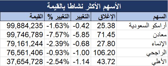 وتصدر سهم "أرامكو السعودية" نشاط الأسهم من حيث القيمة، بـ 100 مليون ريال، وتراجع السهم 1.63%، وجاء سهم "معادن" في المركز الثاني بقيمة بلغت 99.75 مليون ريال.