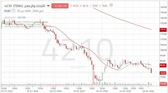 سهم "الأبحاث والإعلام" في اتجاه هابط وسط استمرار الضغوط البيعية, اليوم الثلاثاء 7 أبريل 2026 01:57 مساءً