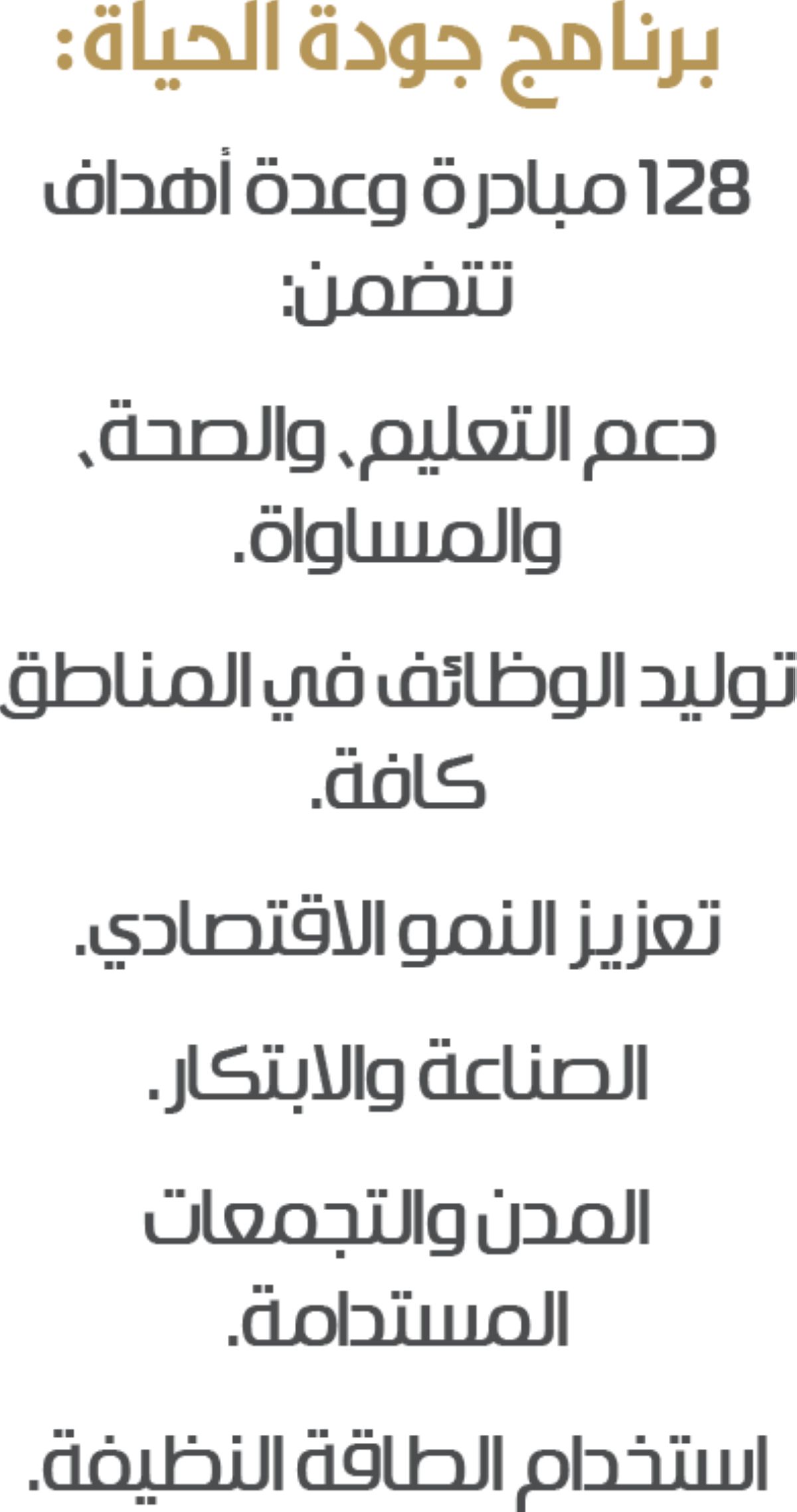 وتتبنى الأمم المتحدة 17 هدفا للتنمية المستدامة على مستوى العالم، ترتبط بالقضاء على الفقر والجوع، وتعزيز الصحة العامة والرفاهية والمساواة بين الجنسين، إضافة إلى تنمية الصناعة والابتكار، وتعزيز استخدام الطاقة النظيفة، وبناء مدن ومجتمعات مستدامة، وغيرها، ويسهم برنامج جودة الحياة من خلال 128 مبادرة في 10 أهداف ترتبط بالتعليم، والصحة، والمساواة، وتوليد الوظائف، وتعزيز النمو الاقتصادي، والصناعة والابتكار، والمدن والتجمعات المستدامة واستخدام الطاقة النظيفة.