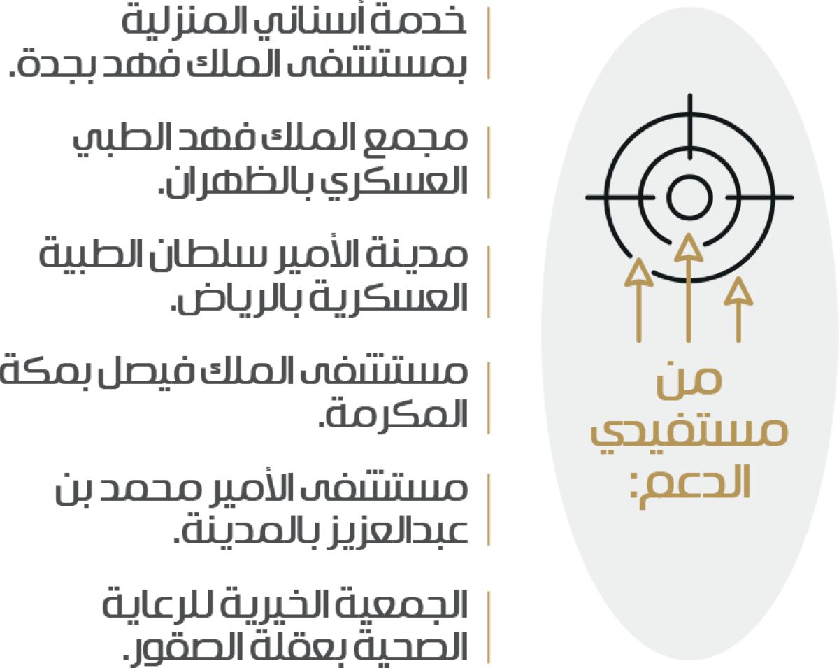 وشمل الدعم المقدم من المؤسسة، خدمة أسناني المنزلية للمراكز الصحية بمستشفى الملك فهد للقوات المسلحة بجدة، ومجمع الملك فهد الطبي العسكري بالظهران، ومدينة الأمير سلطان الطبية العسكرية بالرياض؛ كما شملت الاتفاقيات دعم مركزي الرعاية الصحية المنزلية بمستشفى شقراء العام بشقراء، ومستشفى الملك فيصل بمكة المكرمة، ومستشفى الأمير محمد بن عبدالعزيز للشؤون الصحية بالمدينة المنورة؛ إضافة إلى دعم الجمعية الخيرية للرعاية الصحية بعقلة الصقور.