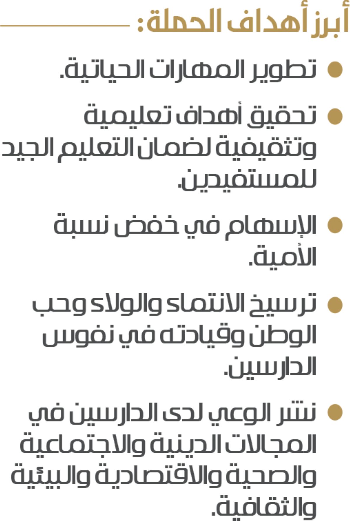 وأضاف أن الحملة هي أحد البرامج التعليمية التي تستهدف فئة من المواطنين والمواطنات في أماكنهم ، وتعليم الدارسين والدارسات المهارات الأساسية ونشر الوعي الديني والثقافي والاجتماعي والصحي لديهم، وتعزيز الحس والانتماء الوطني.