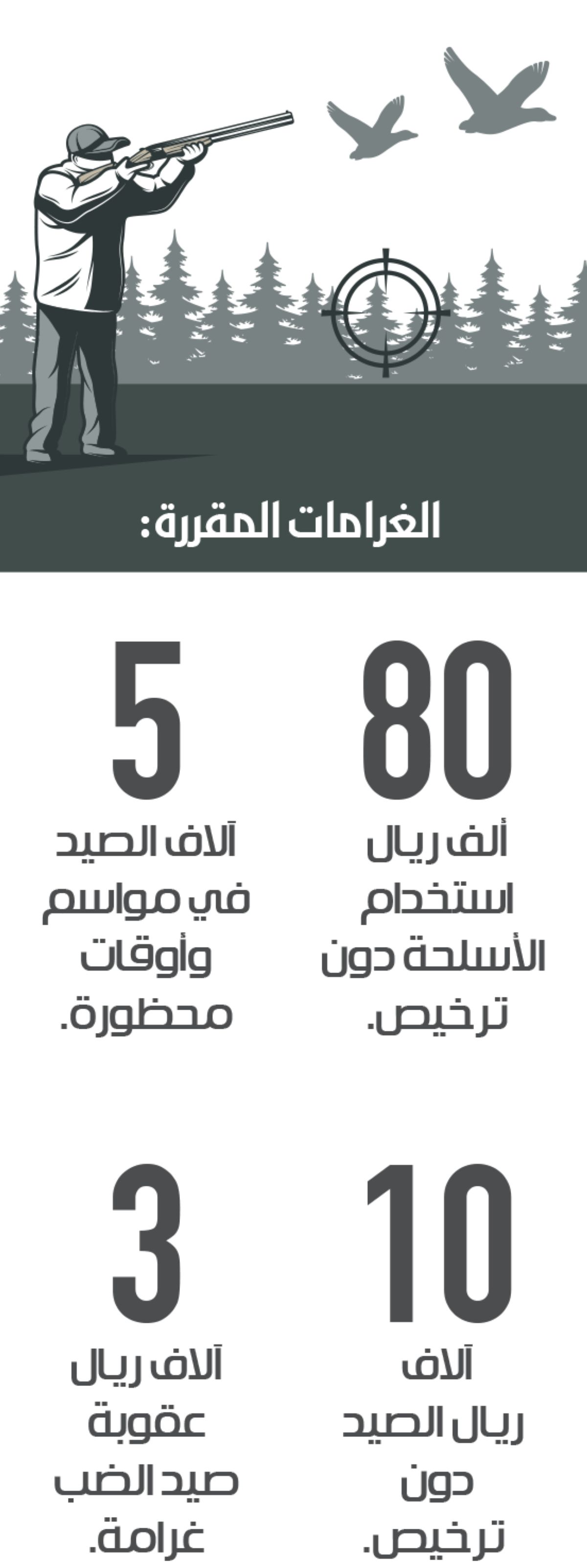 وشددت القوات الخاصة للأمن البيئي على الالتزام بنظام البيئة ولوائحه التنفيذية التي تحظر صيد الكائنات الفطرية، مؤكدة أن عقوبة استخدام الأسلحة النارية في الصيد دون ترخيص غرامة 80,000 ريال، وعقوبة الصيد دون ترخيص غرامة 10,000 ريال، وعقوبة الصيد في مواسم وأوقات محظور الصيد فيها غرامة 5,000 ريال، وعقوبة صيد الضب غرامة 3,000 ريال.