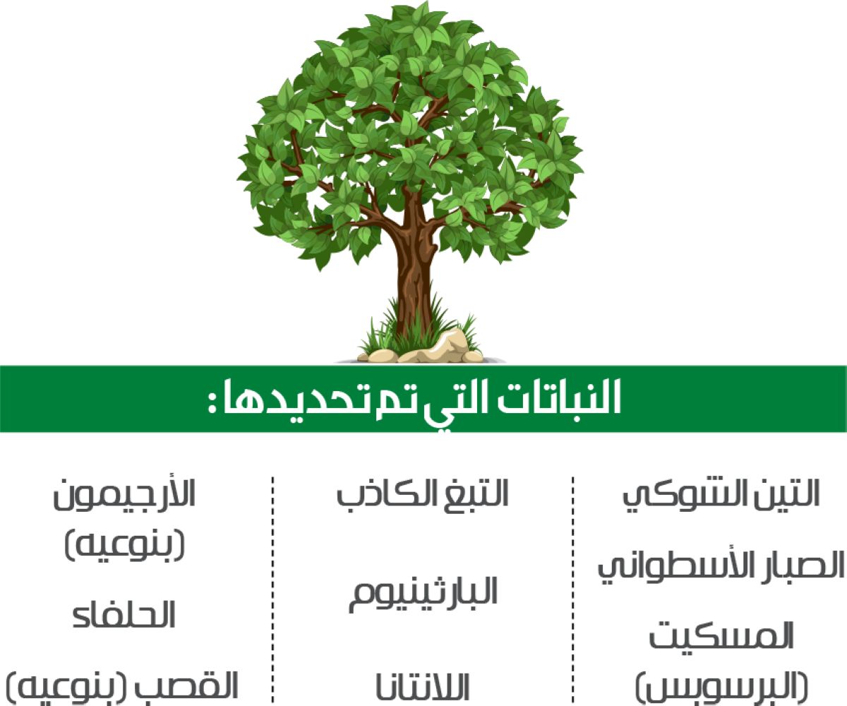 وبين أن النباتات التي تم تحديدها هي: التين الشوكي، والصبار الأسطواني (بنوعيه: صبار هودسن وصبار إبرة حواء)، والمسكيت (البرسوبس)، إضافة إلى التبغ الكاذب، والبارثينيوم، واللانتانا، إلى جانب الأرجيمون (بنوعيه)، والحلفاء، والقصب (بنوعيه: القصب الشائع والقصب العملاق).